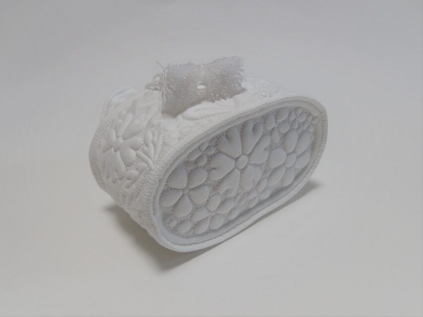 白綿平織り布(コーマ糸使用)、図案、詰め糸(綿、ポリアミドの混紡)、接着芯、コットンアブローダー刺繍糸、コード、フリンジ、針セット、制作手順の説明書